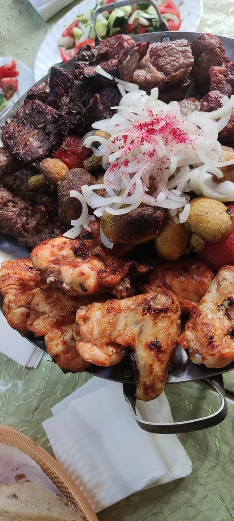 Еда супер вкусная, брали шашлык люля, бараний, куриный и карп, плюс овощи на гриле, салат, чай. Принесли так же лепёшки, соусы разные, сахар и конфетки в подарок. Подача мяса с горкой лука, приготовлено отменно. Наелись все от пуза. Муж брал ещё суп куриный, тоже остался доволен, жирный, с куском курицы, с лапшой. Антураж специфический, но пусть он вас не смущает. Владелец, он же официант, весёлый человек, с шутками и заботой спрашивает что нужно, всё ли хорошо. В общем, если любите восточный колорит, рекомендую. Но не ждите тут лавандовый раф на соевом молоке, не тот формат))) и это прекрасно, если честно. Фотки сделать забыли, слишком вкусно было, слопали очень быстро