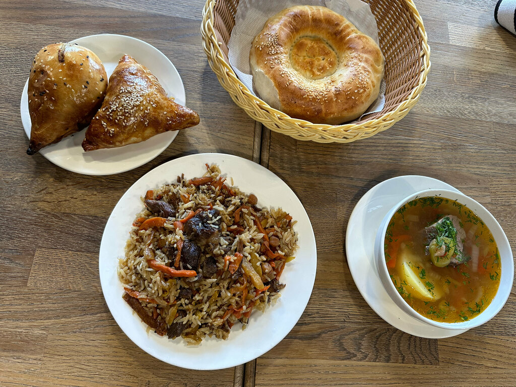 Вкусно! Хороший плов с интересным правильным рисом и вкусным мясом, немного моркови и нута... Шурпа отличная с нежнейшим куском баранины. Компот неплохой. Лепешка средненькая.