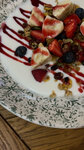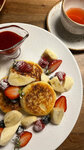 Сырники из сыра Рикотта с фруктами и ягодами, подаются со сливками и клубничным джемом