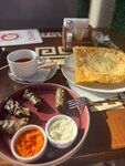 Спасибо коллеге, который узнав, что мы едем в Саки на прогулку, и что мы любим чебуреки, предложил заглянуть сюда. Теперь, в моем личном рейтинге чебуреков - эти, безусловно, занимают первое место! Мы заказали: 1. Юфакъ-Аш, 2. Чебуреки с говядиной, сыром, брынзой и зеленью, королевский (мясо, овощи, сыр). Кстати, чебуреки здесь просто огромные, но при этом тесто «правильное», тонкое, а когда кусаешь, нежное и хрустящее одновременно. 3. Янтык с сыром. 4. Маленькие чебуреки с картошкой и сыром. Порция 3 шт. 5. Манты с собой. Чек составил 2010 руб. Нам все очень понравилось, а что не съели, попросили упаковать с собой. При всем этом, руки были не очень жирными, а животики не испытывали ощущение тяжести. Будете на западном побережье Острова Крым, загляните сюда. И если будете заказывать чайник травяного чая, который подают в медном чайнике, берите объем 0,9 л. Мы взяли 0,5 и нам его хватило а обрез.