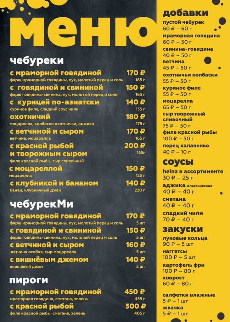 Чебуреки очень большие. Можно заказать мини чебуреки. Есть сладкие 🍎 яблоко и 🍓 клубника (варенье). Они как-то не очень понравились. А так начинки интересные. Заказывали с жюльеном, с сыром, картошка с грибами и мясом. Они были вкусные, запах обалдеть. Объелись, очень сытные. Есть на сладкое хворост. Есть доставка.