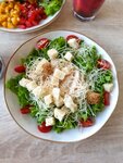 Соус красный, балык, куриное филе запеченное, Моцарелла, грибной жульен, томаты, микс салата, соус Цезарь