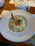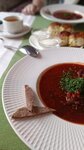 Шикарное оформление стола, блюд и очень вкусно. Рекомендую щавелевый суп с языком и перепелиным яичком. Когда мы здесь обедали 23 февраля, мужчинам за счёт заведения принесли по стопке домашней настойки с изящно оформленной закуской.