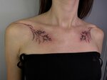 Была сегодня у мастера Валерии на своей первой татуировке. Хотела подчеркнуть ключицы — после обсуждения и просмотра референсов Валерия создала красивый эскиз, который мне сразу понравился. Уже на встрече она с первого раза идеально вымерила симметрию с обеих сторон, и татуировка легла легко и быстро. Больше всего боялась боли, но у Валерии действительно лёгкая рука — неприятные ощущения были минимальными. Приятное общение во время сеанса, внимательность ко всем пожеланиям, скорость работы и, конечно, прекрасный результат — всё это говорит о высоком мастерстве Валерии. Хочется возвращаться к ней снова и снова за новыми татуировками! 🖤
