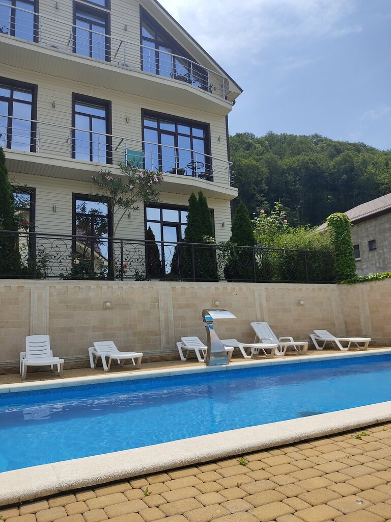 Нам очень понравилось. Все соответствует фото. Очень красивая территория. Бассейны, качели, зелень, цветы. Нам достался шикарный номер на 3 этаже в сторону бассейна и с видом на Агой и горы. До пляжа 20 минут неспешной прогулки. В сезон рядом работает столовая с вкусной едой, закрылась 18.09. Мы успели только 1 день покушать и с собой купили еды. На территории несколько домов, для каждого дома есть отдельная общая большая кухня со всей необходимой посудой. До магазинов также около 20 минут пешком. Мы любители гулять, нас не напрягало. На машине съездили погулять на близлежащий водопад Перун, погуляли по горному лесу, и к скале Киселева. Рядом и автобусная остановка, можно уехать в сторону Туапсе или Небуга. Сам Агой среди гор очень зелёный и красивый. Спасибо хозяевам за гостеприимство🥰