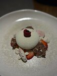 Погрузитесь в мир десертов с черёмуховым брауни, покрытым ганашем с амаретто. Пористый шоколад создаёт идеальное завершение вашего ужина