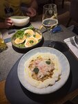 На днях посетили ресторан с молодым человеком на ужин. Хочется поделиться впечатлениями 🥰 Ресторан является победителем премии WhereToEat Siberia 2025, заняв первое место в топ-10 лучших ресторанов Сибири, и это вполне заслуженно! Мы пробовали несколько блюд: — Салат в стиле «Чешуя»: хрустящая рыба в темпуре, свежий дайкон, пикантный крем-понзу и острые семечки горчицы. Очень необычное и удачное сочетание. — Тартар из тунца с авокадо: идеально свежий тунец и яркий перечный соус понзу. — Серые щи с муксуном: блюдо с очень душевным вкусом, напомнившим самую вкусную домашнюю уху, но в изысканной подаче. — Запеченный гребешок под трюфельным соусом: нежный, сочный и огромный, приготовлен безупречно. Абсолютной звездой вечера стали лингвини с камчатским крабом и муссом из пармезана. Это самая вкусная паста в моей жизни, а я пробовала их очень много. Нежнейший краб и сливочный соус делали каждый укус абсолютным наслаждением. Это блюдо теперь на первом месте в моем личном рейтинге ❤️ Также из предыдущих визитов могу отметить крабовые котлеты с трюфельным картофелем и соусом жу, тартар из гребешка с манго и стейк тунца с салатом романо и цитрусовым дрессингом. Отдельно отмечу прекрасное обслуживание и очень красивый интерьер как внутри, так и снаружи. Мы получили огромное удовольствие от вечера и обязательно вернемся снова! ❤️