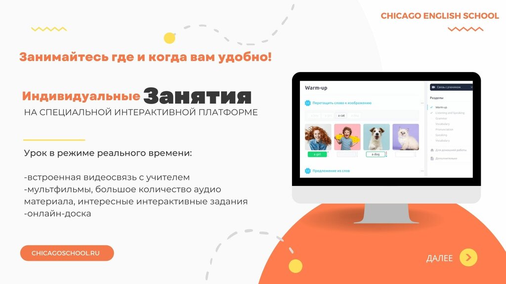 Прекрасная школа с интересной программой и качественной ее подачей на занятиях. Преподаватели профессионалы своего дела и могут найти подход к каждому, выявляя сильные и слабые стороны студентов. Занятия проходят в дружной, непринуждённой обстановке, создавая атмосферу комфорта. В Chicago Вам с помощью методиста подберут подходящую по уровню и под Ваши цели программу, после чего Вы сможете погрузиться в интерактивный мир нескучного английского языка.