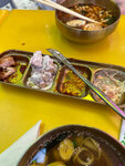 Рис с говядиной, овощами, древесными грибами, яйцом и белым кунжутом. Подаётся с острым соусом и горячим бульоном