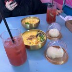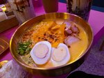 Атмосфера очень приятная, персонал очень общительный и клиентфоориентированый. Чизрамен в сердечке❤️ очень сытный. Из сезонного меню годжо с черникой вкусной, но посыпка сверху портит весь вкус 😣. Корн-дог конечно разочаровал, слишком много теста и не чувствуется сыр😢, но сухая лапша сверху как панировка очень неплохо сочетается ☺️ Для обеда место хорошо подойдет)
