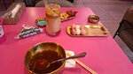 очень милая официантка на входе, сразу сделали комплимент. обслуживание прекрасное! всю посуду уносили своевременно, блюда отдавали быстро. даже неожиданно быстро. все вкусно и сытно, цены приемлимые. крутая атмосфера для любителей розового. фанаты кейпопа запищат!