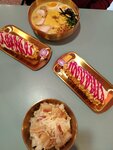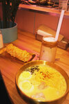 Сырная монетка - шедевр🤩 Рамен - то же очень вкусный и сытный. Дынное молоко - насыщенное. Пришли в воскресенье в 12:40 и уже была полная посадка, урвали последний столик. Но! Еду принесли быстро. Плюсом взяли на вынос десерт - рыбку. От разнообразия меню разбегаются глаза!