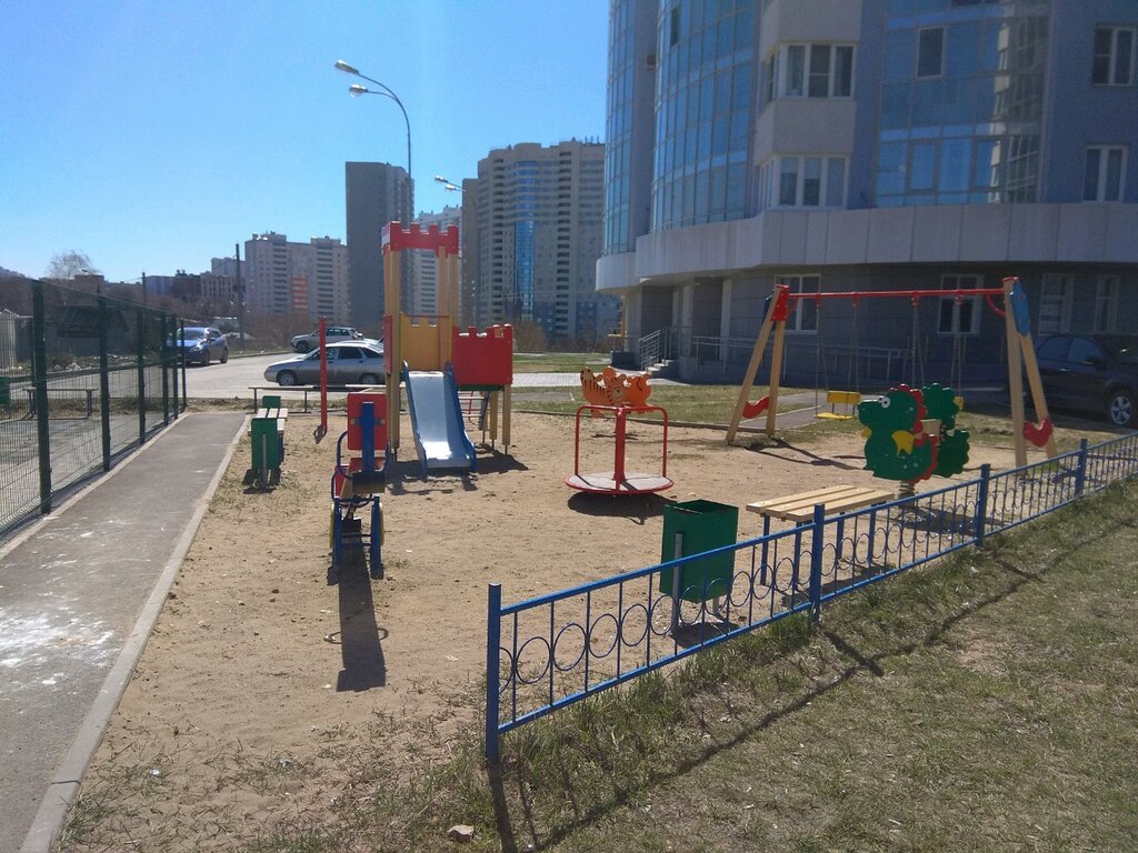 Это не детская площадка, а собачья. Места для игр совсем мало, треугольник, загорежен сеткой, вокруг парк машин. Ничего хорошего.
