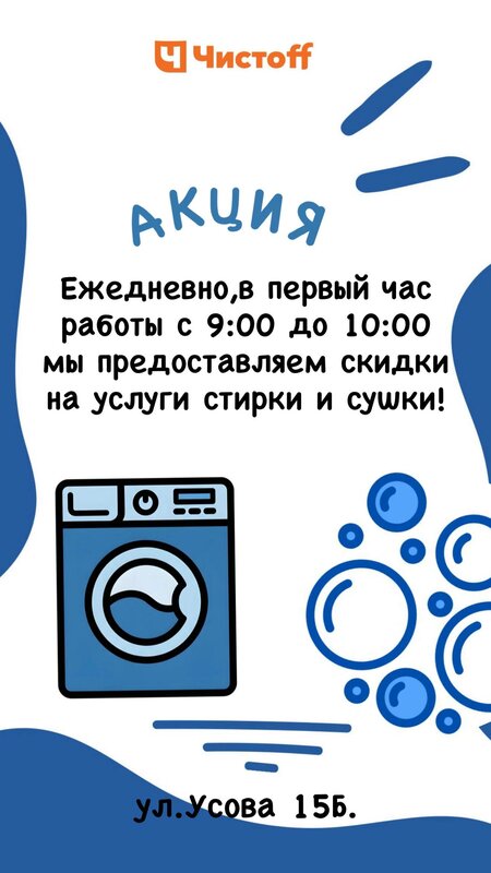 Очень удобный формат прачечной. Когда дома сломалась машинка, довез в чистофф накопившуюся одежду и буквально через 2-3 часа забрал чистую и высушенную. В утренние часы скидка.