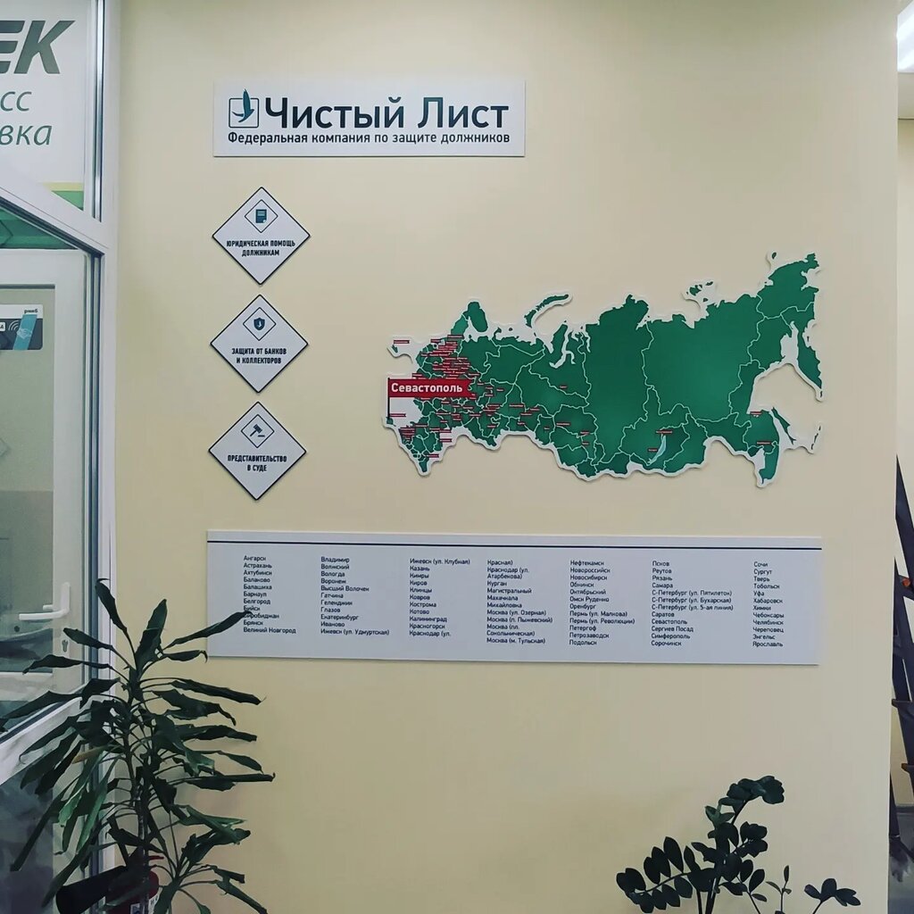 Крупная федеральная компания по защите должников. Представлена более чем в 75 городах России, Работает с 2013 года и действует только в рамках закона. Списание долгов, банкротство вот узкая специализация компании Чистый Лист.
