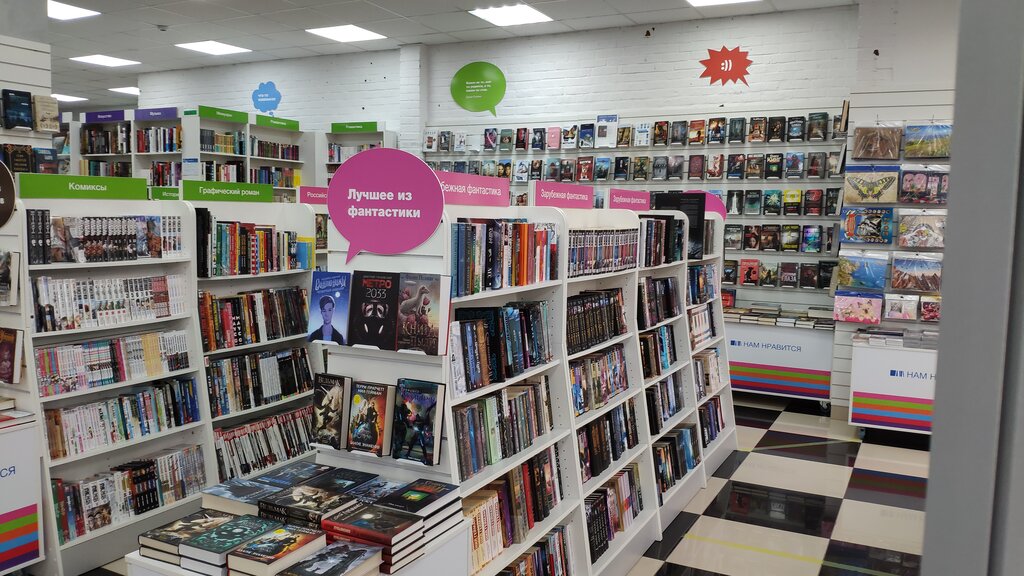 Очень отличный магазин, напоминает библиотеку. Ряды книг, стеллажи по тематике, впереди самое читаемое разложено на столах прям у входа и тишина. Нет только библиотечной пыли и цены космические, а так заходишь и первое впечатление библиотека нидать ни взять продавцы такие же вежливые и всё знают. В общем это место где живут книги и если они ещё не разбежались , значит им там хорошо.
