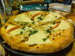 Открытый пирог с тягучим сыром сулугуни. В центре — желток и кусочек сливочного масла. Сочетание нежного сыра, сливочного масла и яичного желтка создаёт богатый и насыщенный вкус