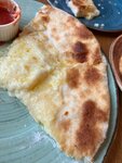 Открытый пирог с тягучим сыром сулугуни. В центре — желток и кусочек сливочного масла. Сочетание нежного сыра, сливочного масла и яичного желтка создаёт богатый и насыщенный вкус