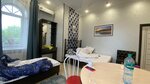 Гостиница не понравилась. Были проездом и жили в трех местном номере. По приезду администратора не было на месте и пришлось ждать у калитки 30 минут. На входе в гостиницу нужно разуваться, при этом одноразовые тапки не предоставляют. В ванной комнате душ находится непосредственно в туалете и вода стекает в слив по центру пола. То есть один человек помылся, другой туда не зайдет, так как пол стены унитаз раковина все в воде. Пол мебель стены - все ушатано и требует ремонта. Из плюсов- есть кухня с техникой.
