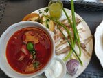 ростбиф, домашняя сметана, сало, зелень, подается с чесночными пампушками и хреновухой