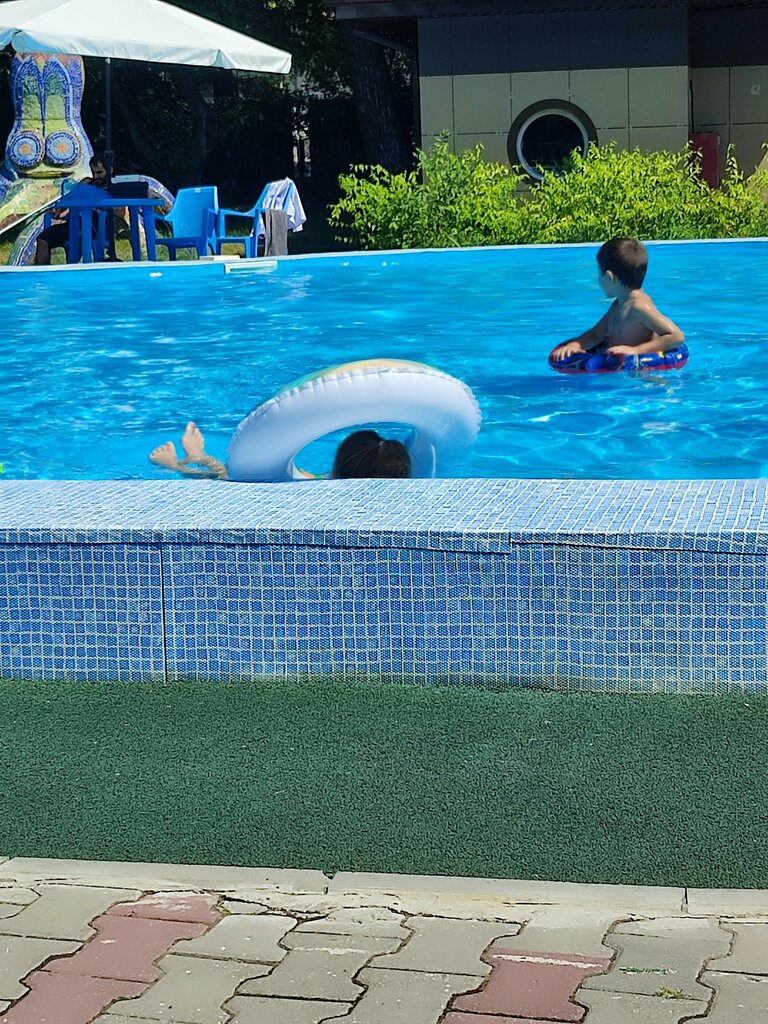 Небольшой, открытый детский бассейн. Вход с 5 лет ( от 110 см). Чистый, вода хлоркой не воняет. Оплата почасовая. Есть раздевалки и туалет. Сидит спасатель, за детьми и дисциплиной следит хорошо. Родители ждут рядышком, за столиками под тентом. Можно купить мороженое, водичку, газировку. Приветливый персонал.
