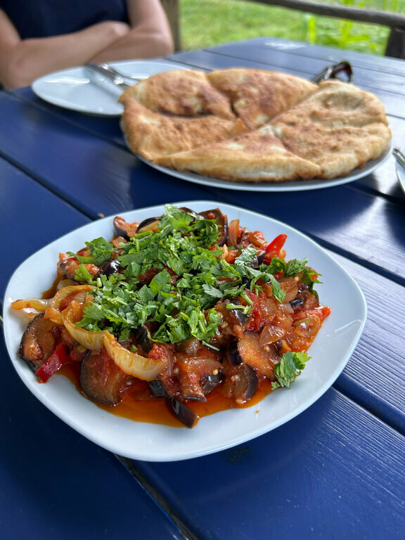 It's so delicious here! Home cooking! Wash your face and lick your fingers! The portions are large. Kharcho soup, khinkali with thin dough, excellent broth, khachapuri, eggplant with tomatoes - everything is delicious! The hospitable hosts treated us to pears and a glass of wine. Don't drive by! Search the map and photos in other reviews.