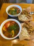 Случайно набрели в районе павелецкой, в поиске рамена. Но в отличии от японской и китайской кухни, вьетнамская всегда более демократичная и сытная. Не в каждом месте вьетнамской кухни есть бун ка! Это мой любимый с мужем суп. Поэтому огромное счастье было его вкусить. Из плюсов: замечательная помидорка и ананас, вкусный бульон от том яма. У мужа был менее насыщенный. Для нас плюс, что без кинзы. Много фунчозы. Рыбка в кляре понравилась, но получилась как сухарик. Хотя и люблю такую, но предпочитаю побольше вкуса рыбы. И, конечно, размер порции 1 литр. Цена тоже порадовала. Съесть, к сожалению, не смогла. Однако еще с собой взяли булочку. С пылу с жару. Понравилось быстрое обслуживание и малое количество народа в выходной вечер, но всё же, народ есть и сменяет друг друга. Уютная обстановка относительно других типовых кафе. В целом: вкусно, доступно и сытно. А что надо еще?