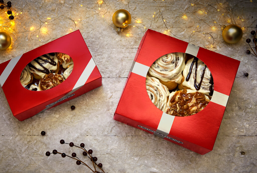 Булочка с начинкой из корицы макара, пропитанная глазурью на основе сливочного сыра (Синнабон). Булочка с шоколадной начинкой, пропитанная глазурью на основе сливочного сыра (Шокобон). Для Мини-пеканбона необходимо заказать отдельный топпинг Мини-пек