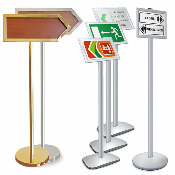 Предназначена для размещения информационных материалов и постеров с двух сторон. Простая смена информация, путем извлечения защитных стекол из прозрачного оргстекла с торца стрелки указателя Изготовлена из полированной нержавеющей стали с "Золотым...