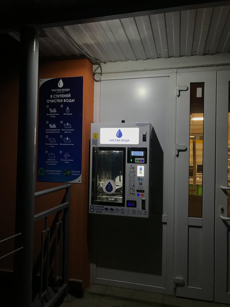 Удобное место, автомат вынесен на улицу. Круглосуточно. Можно посмотреть когда последний раз меняли картриджи. Озонирование. Даёт сдачу, но принимает монеты(если не ошибаюсь)...