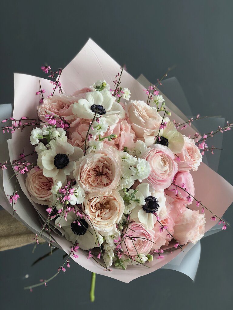 Состав букета:​ Пионовидные розы; Ранункулюсы; Гортензии Анемоны; Маттиола; Гениста. Примерный размер: Высота 40-45 см; Ширина 45-50 см. ​ Упаковка: Транспортировочная коробка; Аквабокс с водой (при t выше 0 С). В подарок: Открытка.