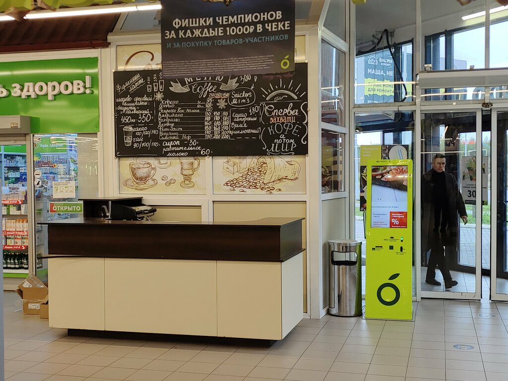 Хорошая точка по кофезаправке! Приветливая продавщица по имени Эля быстро приготовит заказ и обслужит! Очень удобно после закупки продуктов по пути к выходу заправить свой "реактор"!