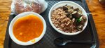 Незатейливый антураж. 5 столов. Первое второе хлеб. Без компота 500₽. Названия блюд и цены неизвестны. Порции большие. В одноразовой посуде. Пришел в 12:05 кроме меня никого. Второй раз сюда, только в случае голодной смерти.