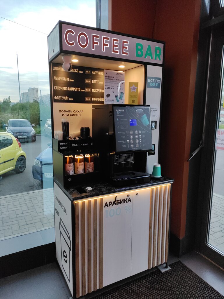 Замечательное место и аппарат для того, чтобы быстро купить и по дороге на работу выпить стаканчик тёплого и вкусного кофе. Сам аппарат работает на "ура": быстро наливает выбранный вами напиток. Сахар, трубочки и тд находятся рядом и всегда под рукой. Отлично подойдёт для интровертов :) А если серьезно, то ставлю 5 звёзд данному приспособлению. Даже в честь открытия открыли акцию с бесплатным кофе каждому, кто захочет!! Респект ребятам.