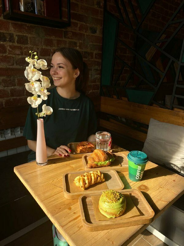 Приятное заведение, уютный интерьер, вежливые сотрудники. На полках рядом с нами были интересные книги про кофе и котиков. Почему оценка 4: горячий шоколад был изумительный, высший бал! А вот круассан на 3 "с минусом", начинки не ахти сколько, курочки совсем уж пожалели. В целом хорошее заведение, обязательно попробую здесь ещё десерты.