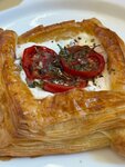 Слоёная сытная выпечка в форме лодочки с начинкой из сыра фета и томатов конфи.