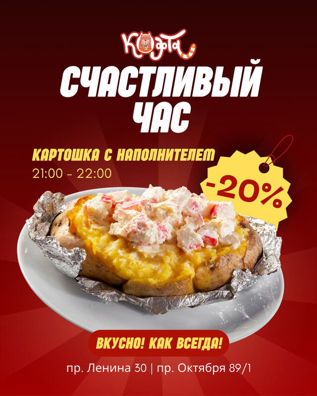 Крошка Картошка супер, кофе и какао тоже очень вкусное, также брала десерт, но как мне показалось немного дороговато. Всегда очень вежливые сотрудники, желаю процветания данному заведению. Также хотелось бы большего разнообразия десертов и салатов для картошки
