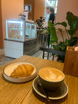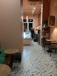 Уютное светлое местечко в спальном районе , внимание к мелочам типо кружечек , хороший выбор кофе , цены средние , круассаны бомба мягкие и не разваливаются , и осенняя фишка какао на меде с пряностями , я не любитель меда но оч зашло , рекомендую средний чек кофе десерт 500-600, сидел с краю тк в основной части сидели семьи , при входе два три столика самое то с мелким пёселем