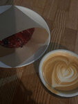 приятное место, хоть и не сильно примечательное на первый взгляд. выбор зерна интересный, есть фильтр. флэт был вкусный, но дело было вечером, так что горчинка присутствовала. выпечка до приятного простая. булочка со смородиной не приторная, зашла! латте арт 🫶🏻