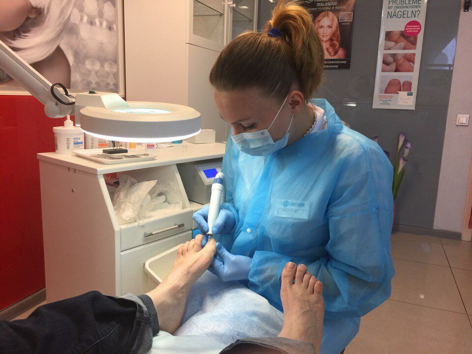 Педикюр с обработкой грибковых ногтей и стопы. Снятие высоты грибковых ногтей.