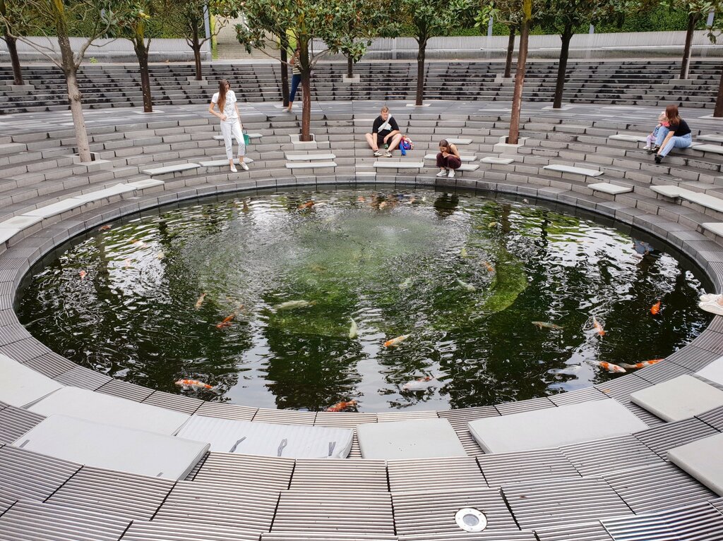 Замечательное место! Рыбы, фонтан, тень, красивые деревья.