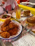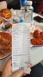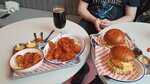 Курица топ! Сочная и вкусная.можно выбирать из 5 видов остроты! Для начала берите средний уровень. Ещё респект за нормальные металлические приборы.металлические тарелки и стеклянные бокалы для пива.жаль нету разливного пива! Хотя бы простенького бада как у соседей.есть только два вида крафта в банках - вишнёвое руби и стаут мороженое(айс крем).помещение белое и светлое.