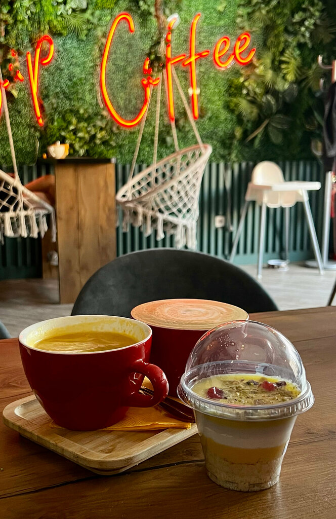 Вкусное кофе , есть авторские кофе 👍 в самом помещении давольно креативно , качели , столик для детей с раскармками и игрушками , интерьер прикольный .