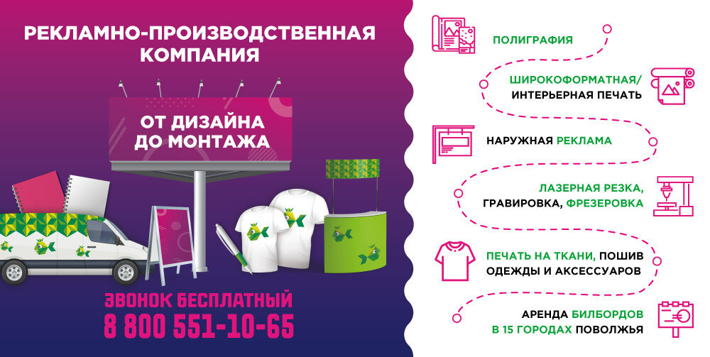 Types of print:banners, posters, interiors, on fabric, on metal, on wood, on leather, on canvas, on film, on plastic, on magnets, on cardboard, on vinyl