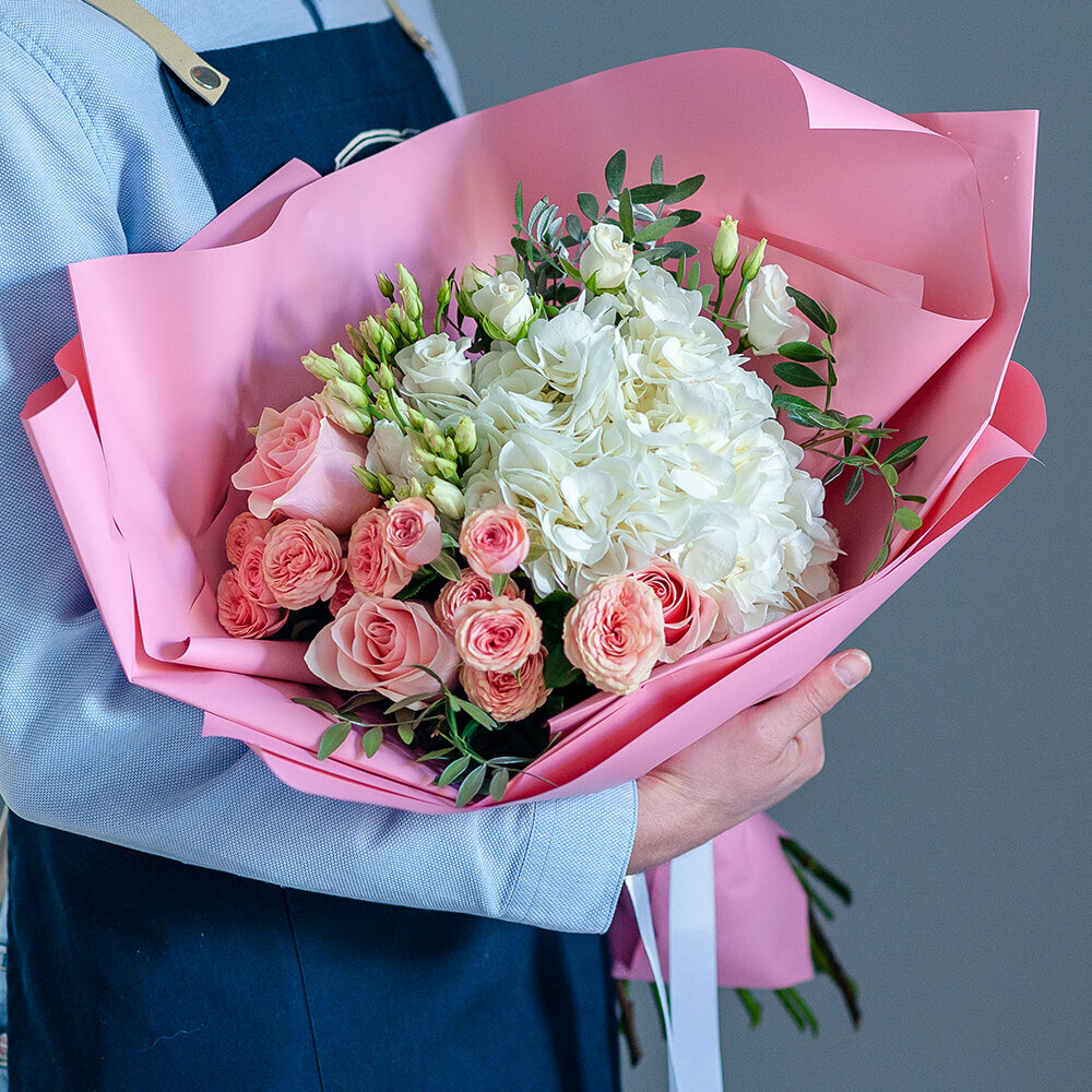 Микс гортензии с сантини в нежном оформлении