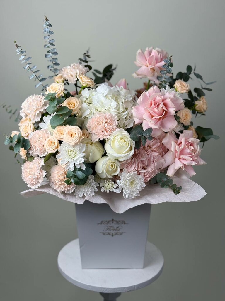 Пышная композиция из цветов в нежных оттенках. Подойдет для подарка на свадьбу, юбилей, день рождения. Состав: гортензия, пионовидная роза, кустовые розы, гладиолус (сезонный цветок, в случае отсутствия флорист заменит на более подходящий), гвозд...