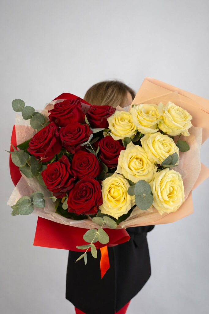 Состав: роза французская Мондиал листья эвкалипта тишью пленка декоративная лента атлас 222-420 Круглосуточно.
