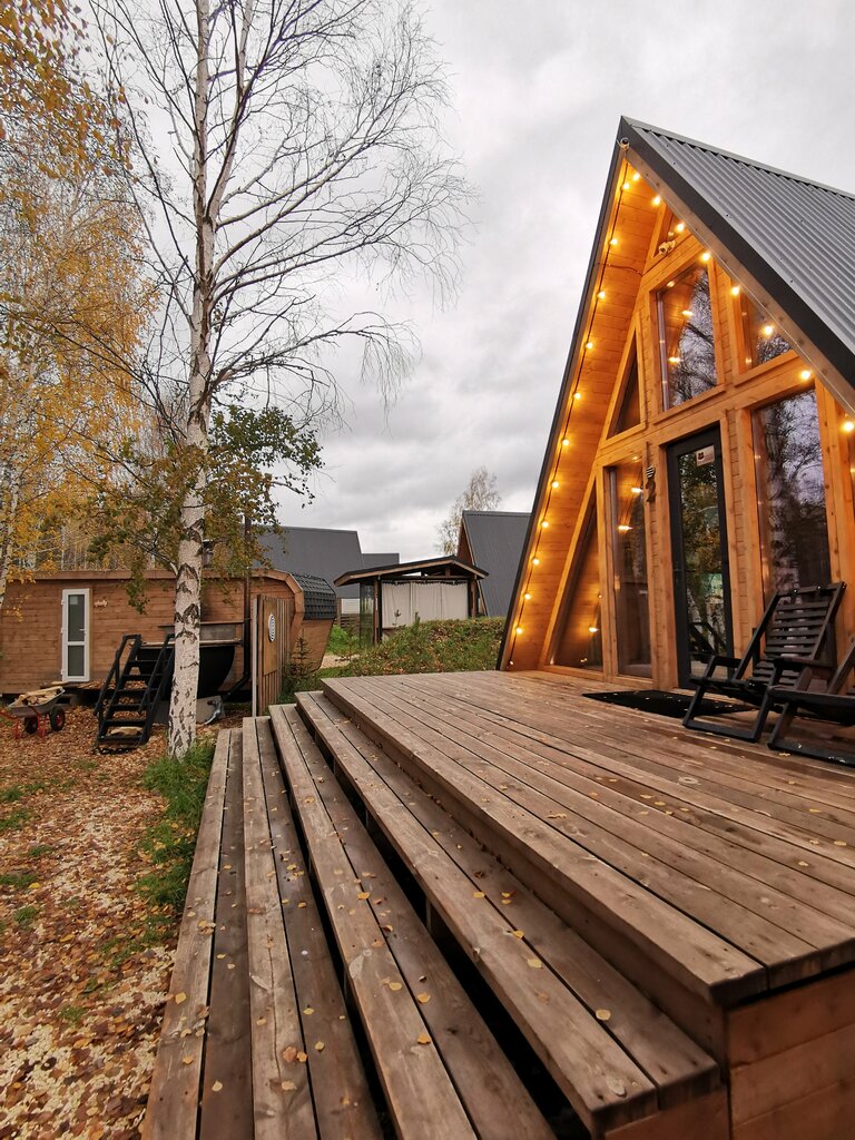 Большой A-Frame - это 6-местный домик с террасой, мангальной зоной и беседкой.