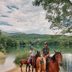 Хорошее место. Я сюда вернусь и приведу друзей. Очень любезно ответили на вопросы, встретили, подобрали шлемы, сёдла и лошадей, провели инструктаж и научили как управлять конём (это легко). С нами был ребёнок 9 лет (1,3м) для неё подобрали послушного коня, этого коня привязали поводом к коню идущем спереди с инструктором. Интересные места по которым нас водили, подъёмы и спуски с холмов, широкие поляны и узкие тропы в лесу, через маленькие ручьи, остановка под водопадиком «Козырёк», вокруг большого водоёма. Во время прогулки я прямо с коня успевал рвать кизил и яблочки которыми можно покормить лошадь по окончании прогулки. Заказывайте прогулку на два часа, мы гуляли три часа и нам оказалось многовато, да и основные локации вы пройдёте за два часа.