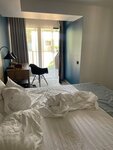 Отличный отель, расположен в центре города и в тоже время очень тихо на территории. Четкая работа персонала. Уборка каждый день, замена полотенец ежедневно, смена белья раз в три дня. Еда шведский стол, голодным не останешься- мясо, рыба, овощи, фрукты, арбуз, дыня каждый день. Печенье, зефир, безе к чаю. Хорошая кофемашина. Кулеры с водой на этаже. Бассейн чистый, подогреваемый. Лежаков достаточно.Территория небольшая, но уютная и зеленая. Мы жили в номере люкс, номер с террасой с выходом к бассейну, во двор. Номер двухкомнатный, в гостиной тахта и маленький диван, как спальное место только для ребенка. Анимации два раза в неделю не было, была одна пенная вечеринка за десять дней.Но, нашей дочке это уже несильно интересно. Есть небольшая детская комната, без воспитателя. Про пляж не скажу, официально закрыт. В целом, нам понравился уровень отеля. Спасибо за все! Будет возможность, приедем еще раз)